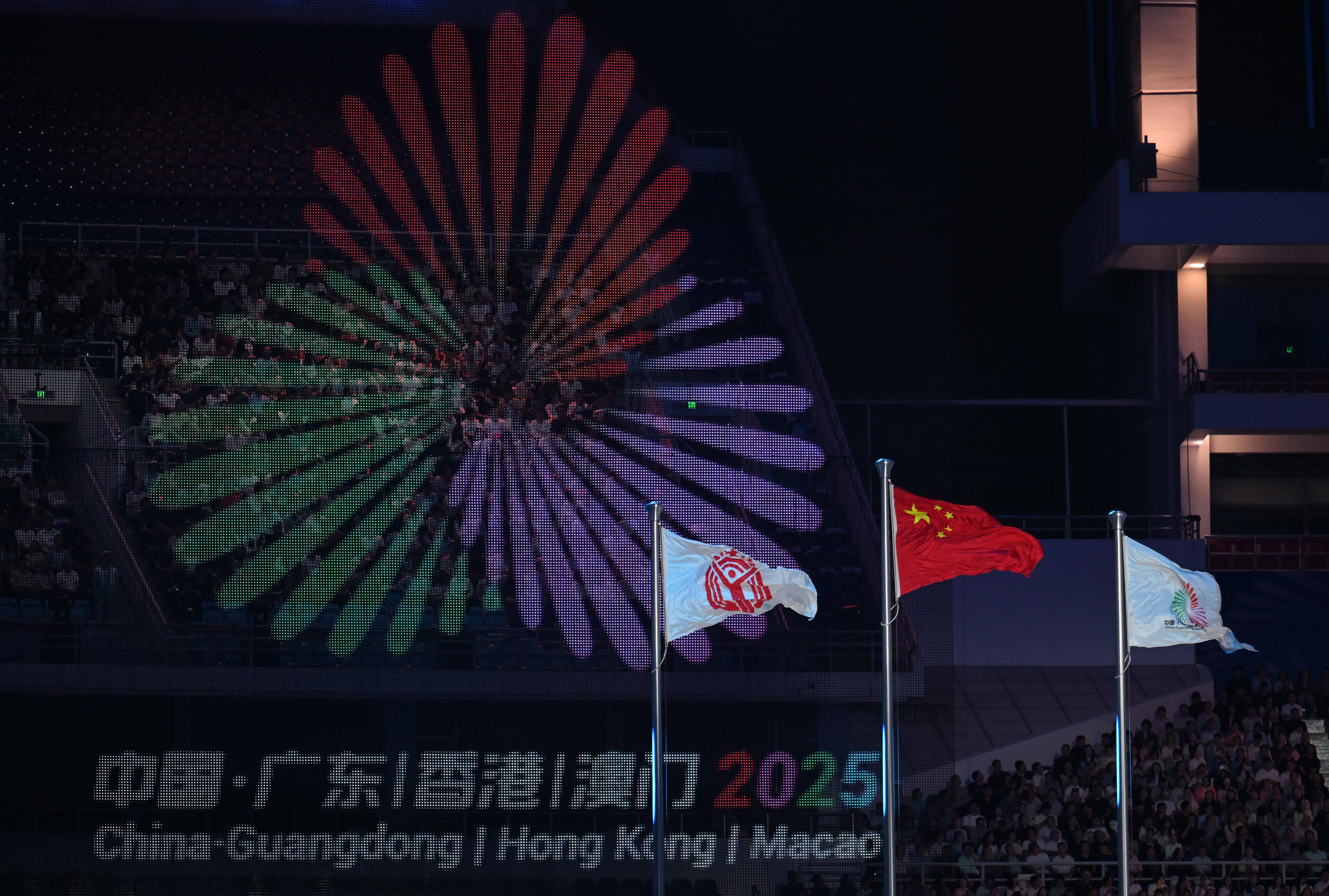 11月9日,广东省体育代表团、香港十分行政区体育代表团和澳门十分行政区体育代表团在入场典礼上共同入场。新华社记者 杨冠宇 摄20时26分,广东奥体中心、香港金紫荆广场、澳门小脚花广场同期升起五星红旗。
