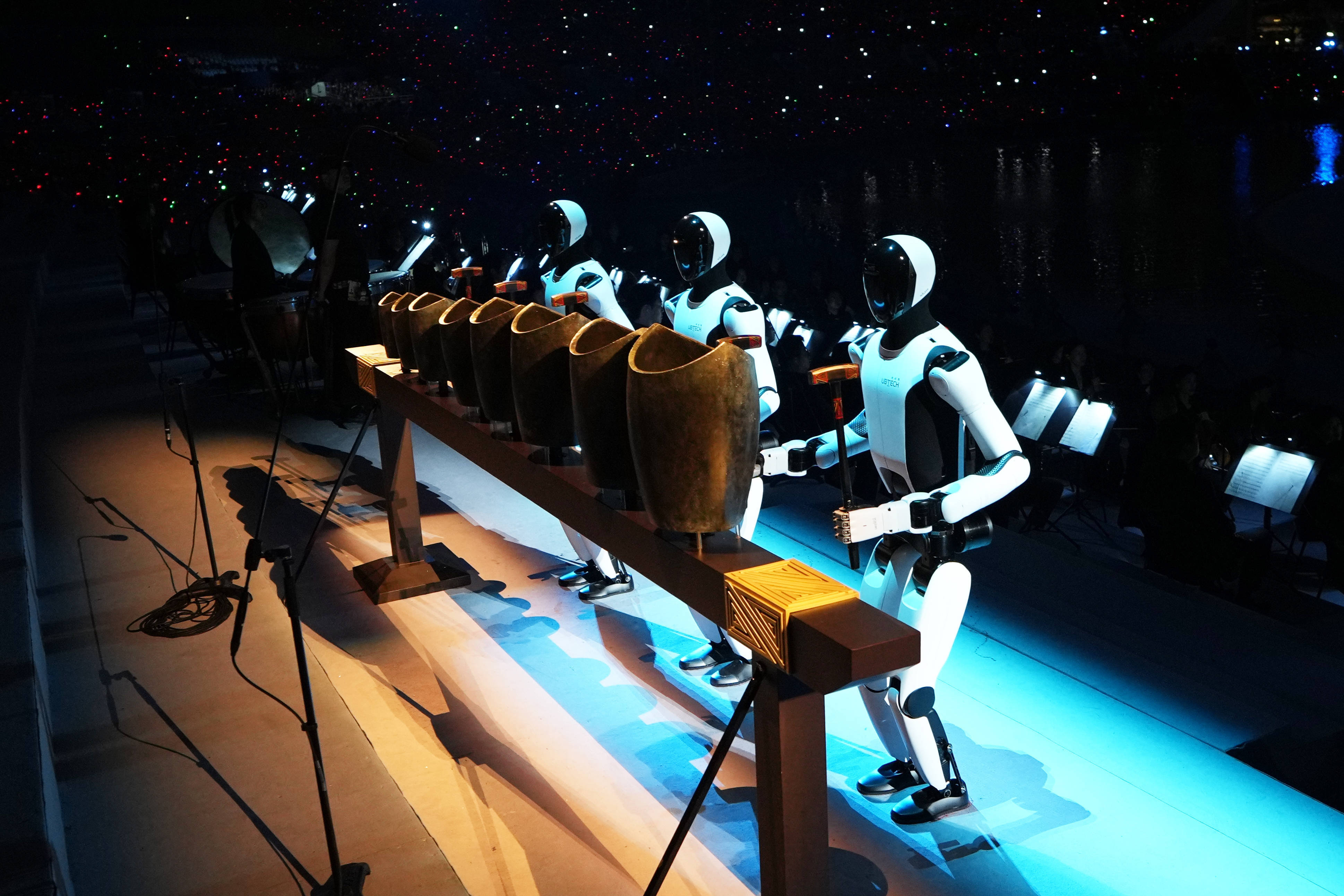 这是11月9日拍摄的开幕式上的机器人献技。新华社记者 李一博 摄“青铜句鑃”的原型出土于广州越秀象岗山的南越文王墓。源自秦末汉初礼乐师具的原声样本,经尽心编曲,重现千年遗韵。