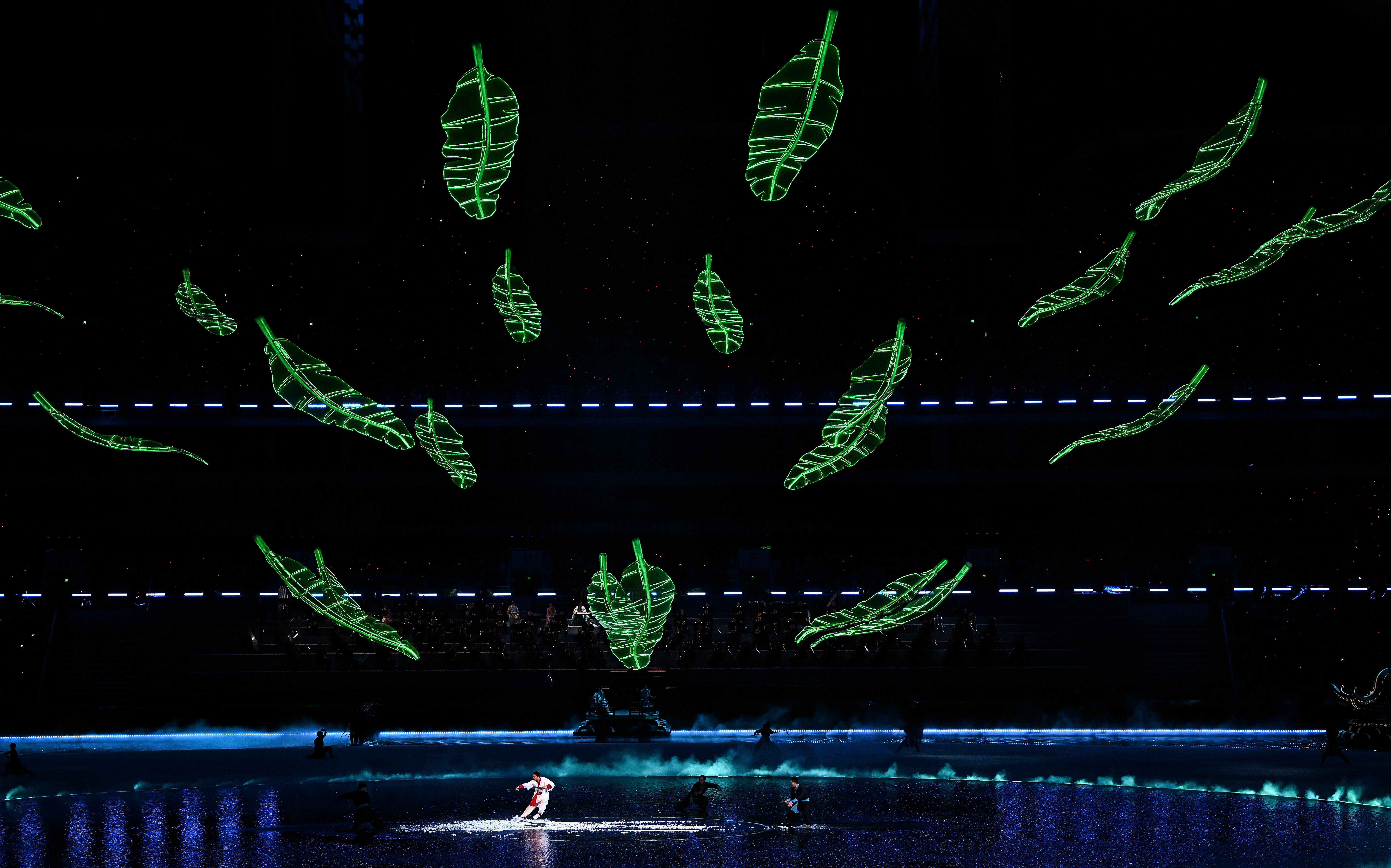 11月9日,演员在开幕式现场献技。新华社记者 杨冠宇 摄节拍忽转明快,足球、篮球、排球、骑行等体育元素跃然台上。歌曲《龙腾零丁洋》将歧视推向高涨。奔走的飞人与跃动的激光竞速,水上健儿在波澜中冲刺,展现科技与体育的和会。