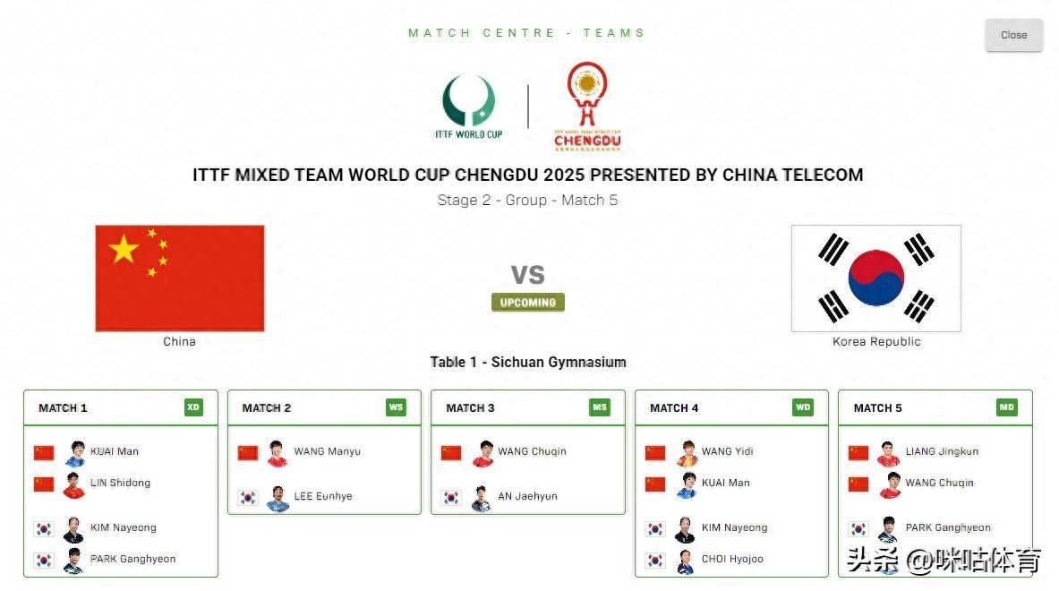 首场混双对决由林诗栋/蒯曼迎战韩国组合朴康贤/金娜英,随后王曼昱、王楚钦接踵登场,分歧在女单、男单赛场对阵李恩惠与安宰贤。