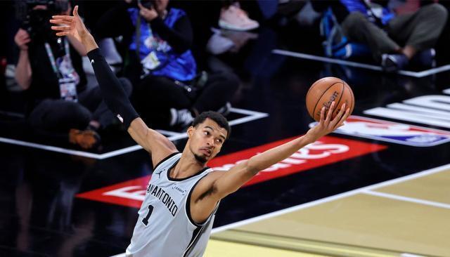比赛期间还剩5分06秒,文班亚马重新上场,这时候马刺94比95逾期1分。文班亚飞速来之后空接上篮,可惜皮球在篮筐上沿转了一圈又出来了。卡斯尔的上篮被霍姆格伦盖掉。马刺发底线球,卡斯尔平直将球往篮筐上传,文班空接扣篮得分。